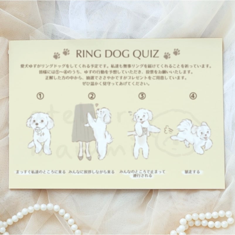 リングドッグをするワンちゃんの行動パターンをゲストの方に投票していただけるクイズ形式のご案内イラストです。