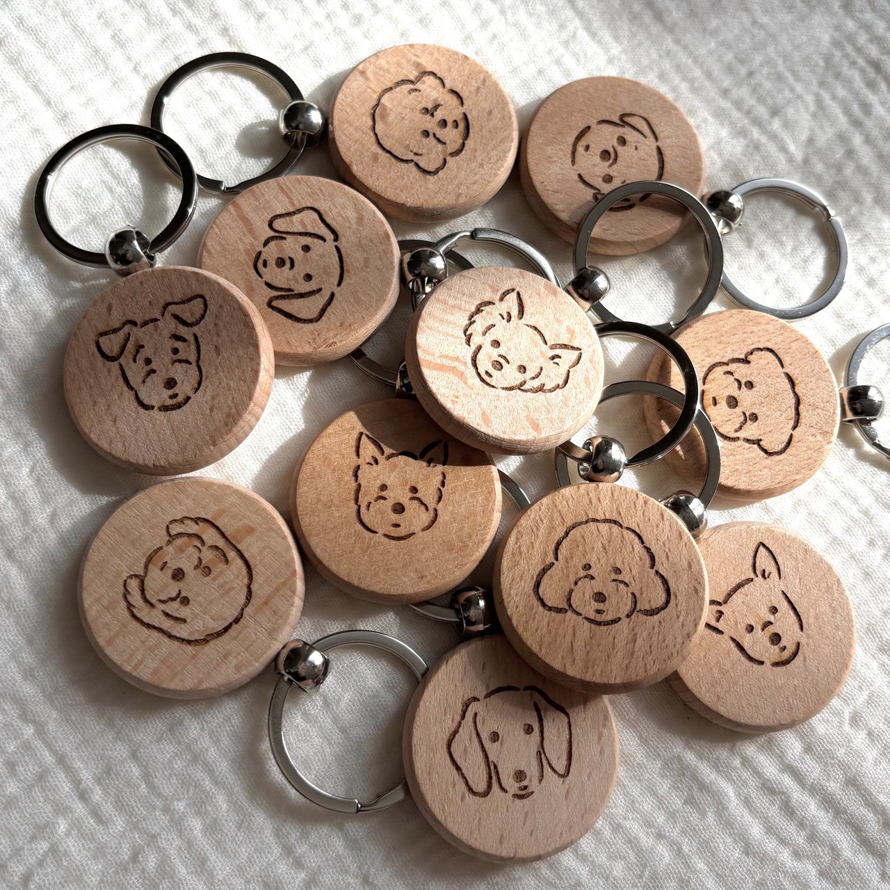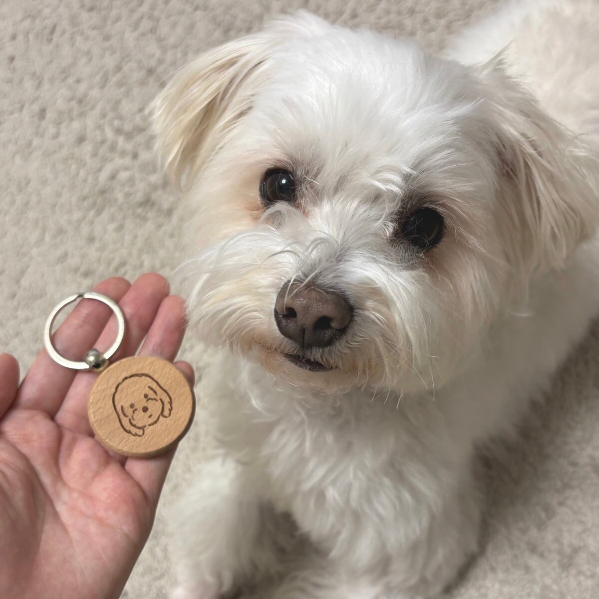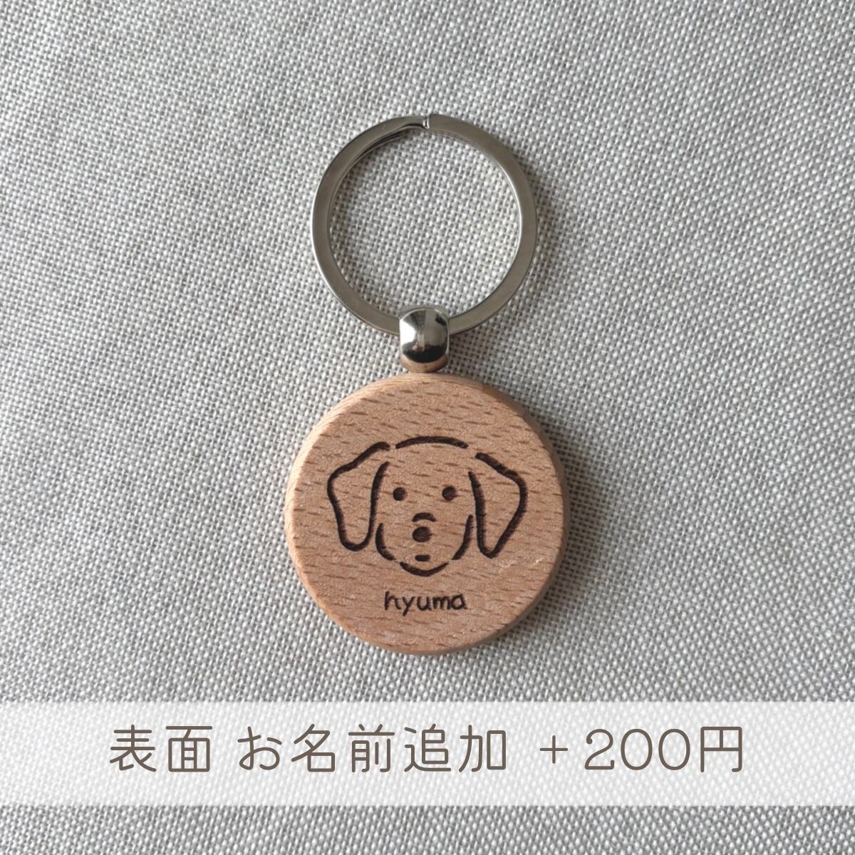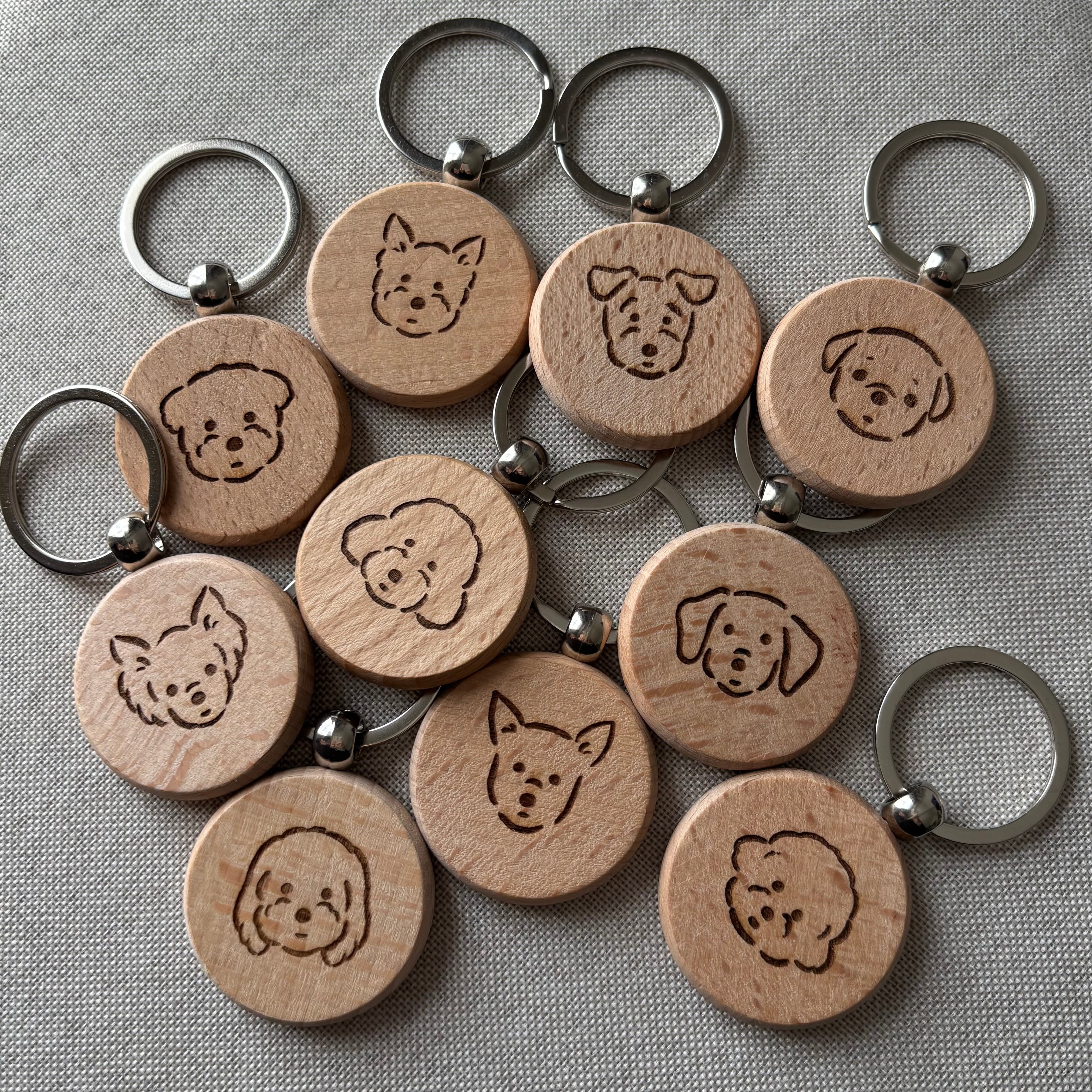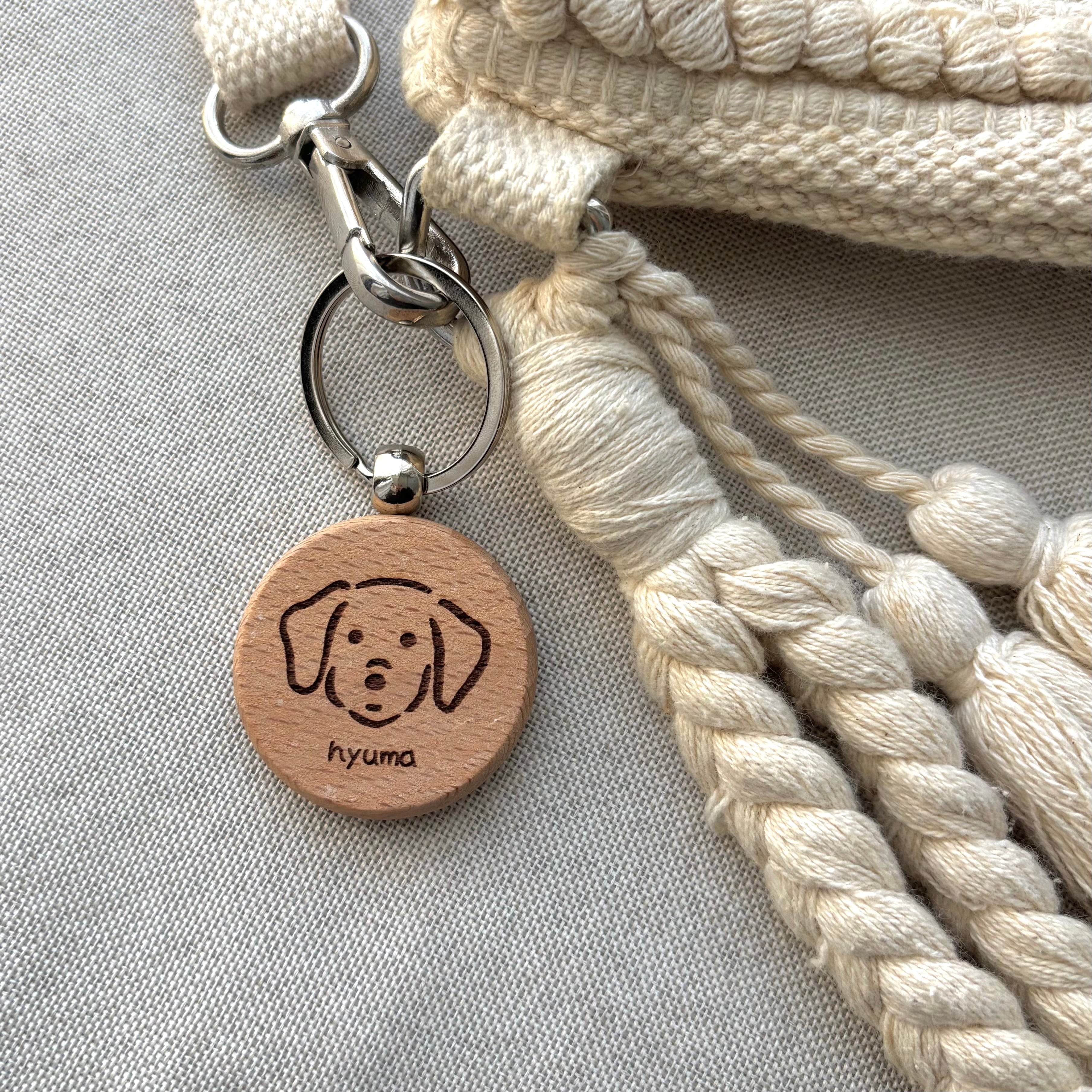 ころんとした丸いフォルム 木のぬくもりがやさしいワンちゃんのキーホルダー。